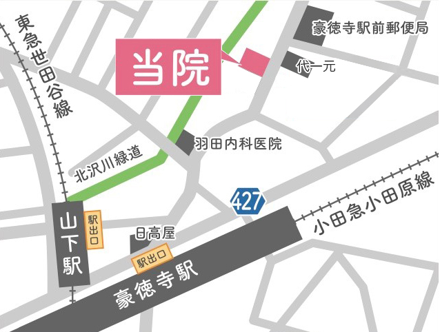 - 当院は小田急小田原線「豪徳寺」駅・東急世田谷線「山下」駅から徒歩2分と、どちらの駅からもアクセスしやすい立地です。