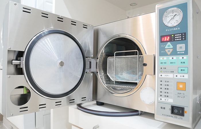 それぞれの器具に適した滅菌器を使い分けることによって、器具についたウイルスや細菌を死滅させています。 お口に入る器具はすべて滅菌した清潔なものを使い、患者様ごと・使用ごとに取り換え、衛生的で安全な環境で医療を提供するために、徹底した衛生管理・院内感染対策に努めています。また、診療時に使用するグローブ、紙エプロン、紙コップ、麻酔用注射針などは、全て使い捨て(ディスポーザブル)にしています。