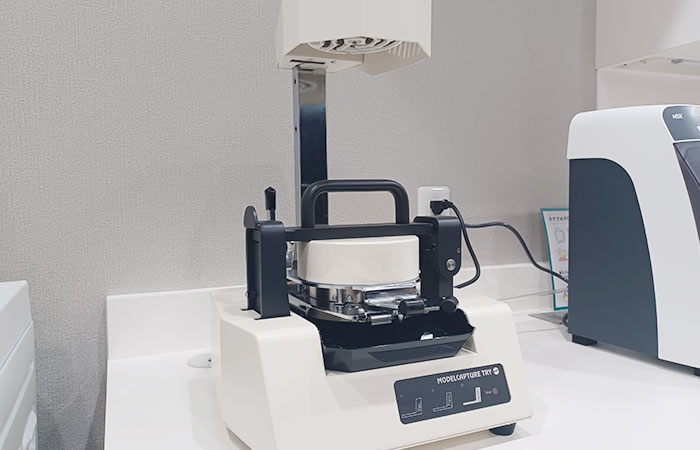 個人用マウスピースやホワイトニングトレーなど、各種トレー作成のための機械です。当院では、従来の吸引成型と違って最新の「真空加圧成型器」使用することにより精度の高いマウストレーが製作できるので、長時間付け心地がよく使用していただけます。